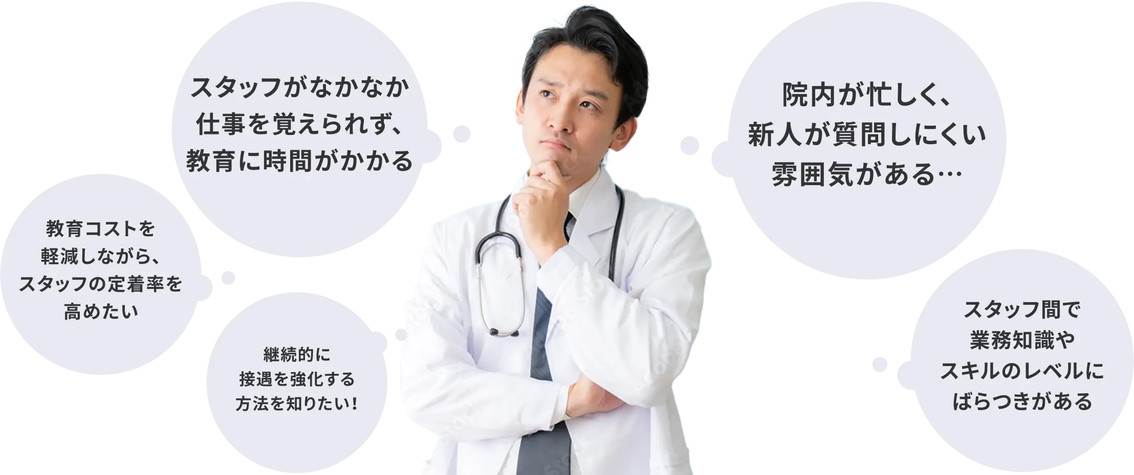 新人スタッフのスムーズな医療事務知識・接遇の習得を後押しするとともに、教育にかかる既存スタッフの業務負荷をサポートします。