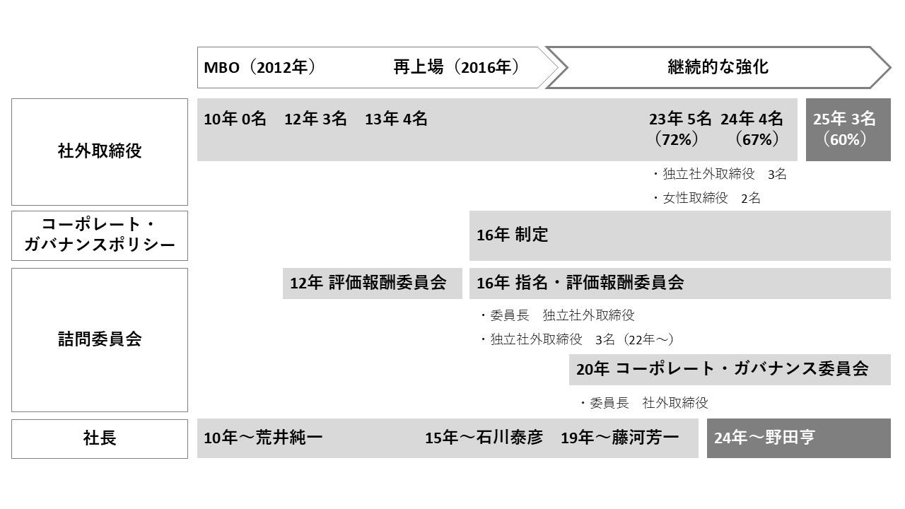 取締役の半数以上を社外取締役とすることで、経営の監督機能を強化するとともに、企業経営の透明性・客観性を確保することができ、また社外取締役の豊富な経験と幅広い見識に基づく的確な助言を受けることで、経営の適切な意思決定が可能となるものと考えています。