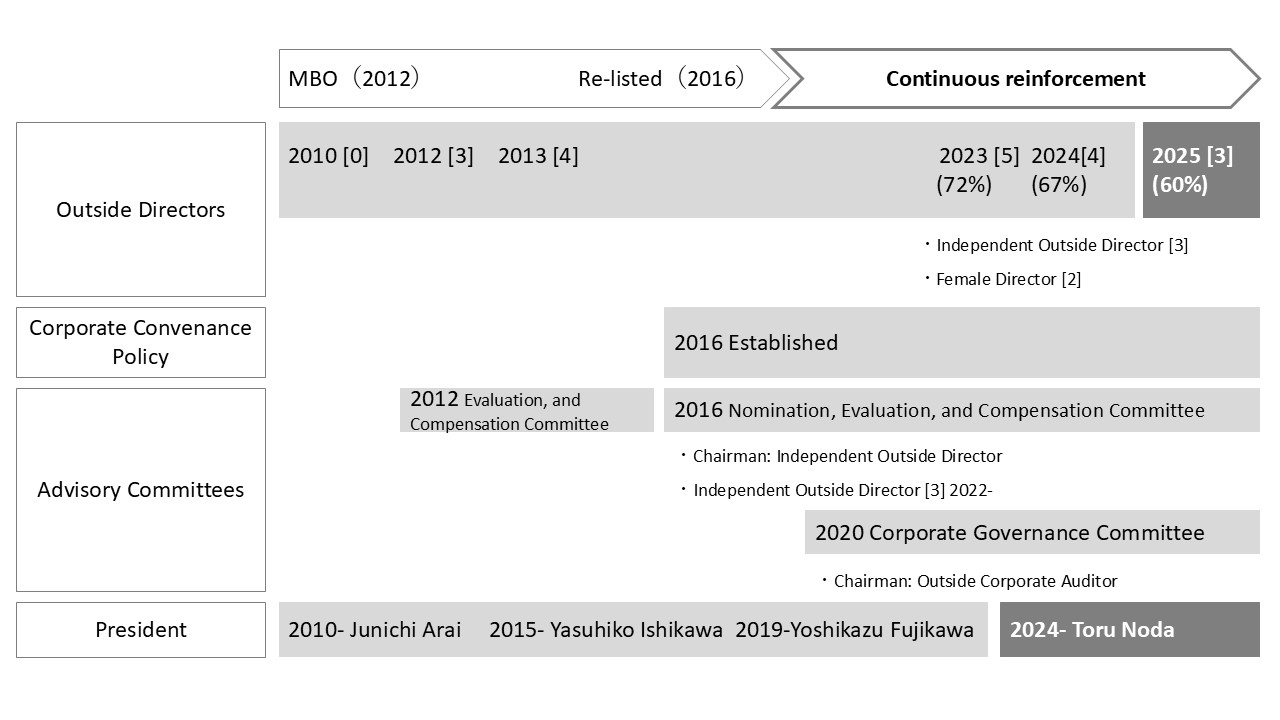 The Board of Directors consists of five Directors (including three Outside Directors) and is chaired by the President. The Board of Directors aims to realize proactive governance through prompt and decisive decision-making and appropriate risk-taking in order to enhance corporate value over the long term after having established fairness and integrity. In addition to ensuring the effectiveness and transparency of management through the exercise of oversight functions over overall management through decisions on important business execution, the supervision and approval of candidates for Directors and Corporate Auditors and the appointment of corporate officers, and supervision and approval of annual budgets, medium-term management plans, and other important strategies, it also monitors the efforts of corporate officers, including the President, to increase corporate value. In addition, our Board of Directors have a 1-year term of office in order to clarify management responsibilities and enable the Company to respond swiftly to changes in the business environment.