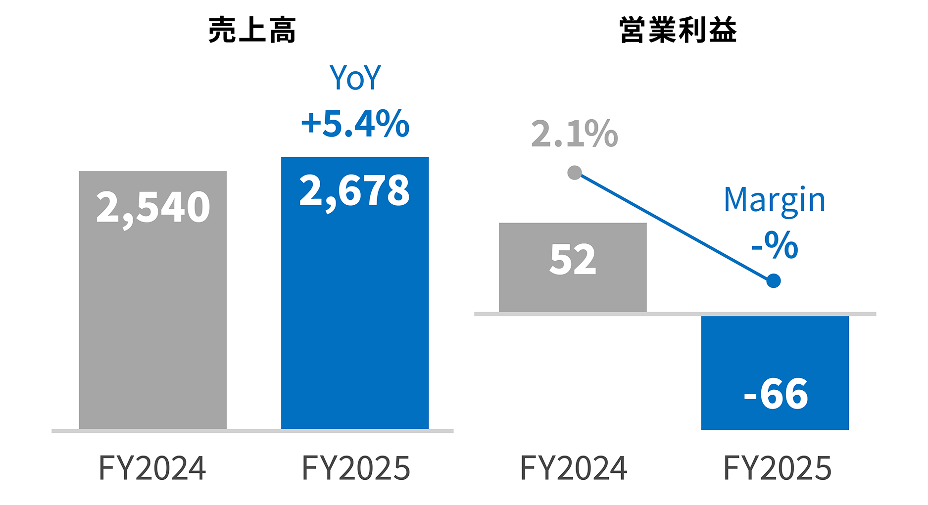 売上高は、公定価格の改定に伴う単価の上昇等により、前年同期比5.4%増の2,678百万円となりました。損益面においては、保育士の処遇改善、保育士の補充強化のための採用費増及び水道光熱費等の施設経費増により、66百万円の営業損失となりました。