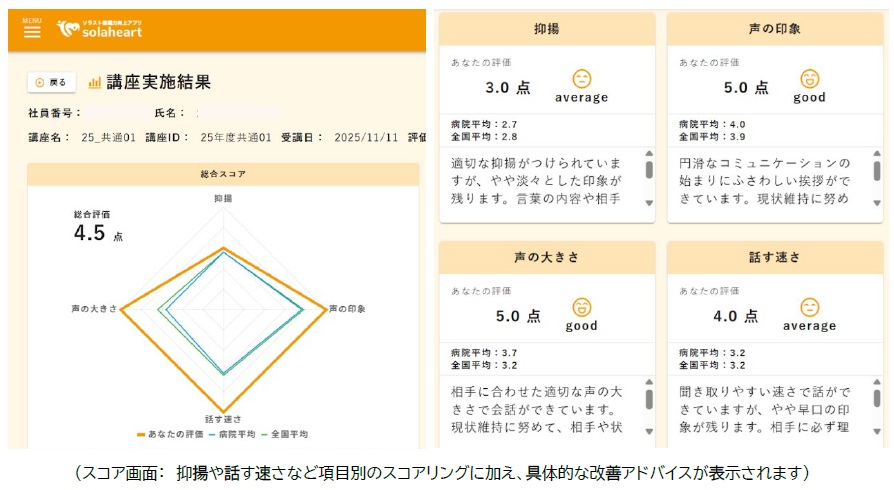 本アプリには、実際の医療現場を想定した具体的なシチュエーションに基づく「対人ロールプレイング」や、場面に応じた声掛けや挨拶などを練習する「反復トレーニング」など、複数の教材が搭載されています。トレーニングを通じて収録された職員の発話は、声の大きさや話す速さ、声の印象、抑揚など複数の観点から詳細に分析されます。その解析結果をスコアとして可視化し、具体的な改善ポイントとともに本人へフィードバックすることで、自身の接遇を客観的に振り返ることが可能になります。また、評価結果に応じて、当社の教育プラットフォーム「terrace studio(テラススタジオ)」が提供する関連コンテンツをリコメンドし、個々の弱点を克服するという、効果的なスキルアップのサイクルを実現する仕組みを整えています。