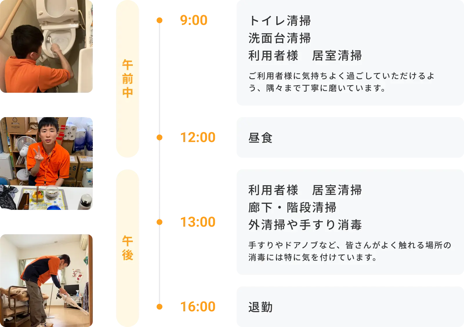 現在は、居室や共有部の清掃、手すりの消毒など幅広く担当しています。中でも特に力を入れているのはトイレ掃除です。ご利用者様はご高齢のため汚れやすい場所ですが、たとえ時間がかかっても、毎日丁寧に磨き上げることを大切にしています。 入社して一番嬉しいのは、自分で働いたお金で趣味の鉄道旅を楽しめるようになったことです。これからも課題に向き合いながら、ご利用者様に気持ちよく過ごしていただけるよう、一生懸命に清掃に取り組んでいきたいです。