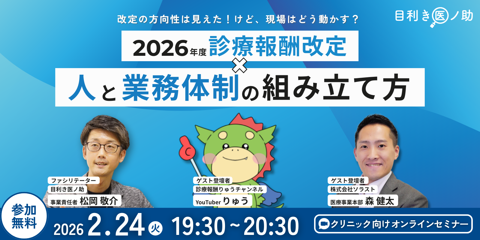 【目利き医ノ助×ソラスト×診療報酬りゅう氏共催】ぶっちゃけどうなの?2026年度診療報酬改定「要点解説と実務対応」~りゅう氏と描く、逆算ロードマップ~