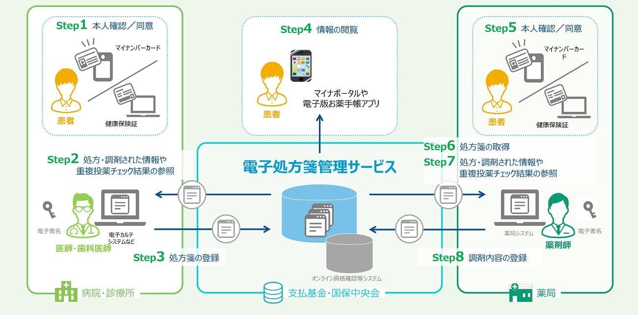 なお、医師は患者さんに処方する薬の情報を「電子処方箋管理サービス」というシステムにデジタル形式で記録し、電子的に送信します。